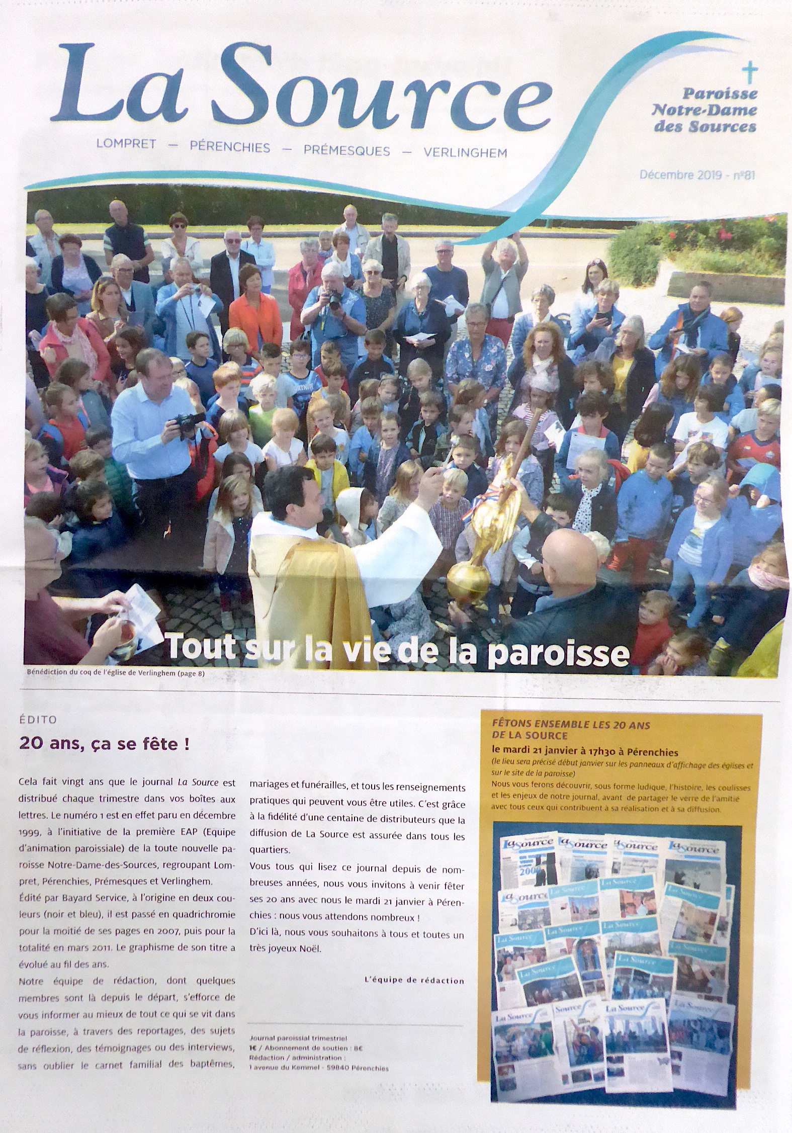 Sur l'invitation en une du dernier numéro de La Source, on peut lire cette invitation "Fêtons ensemble les 20 ans de La Source le mardi 21 janvier à 17h30 à Pérenchies. Nous vous ferons découvrir, sous forme ludique, l'histoire, les coulisses et les enjeux de notre journal, avant de partager le verre de l'amitié avec tous ceux qui contribuent à sa réalisation et à sa diffusion."